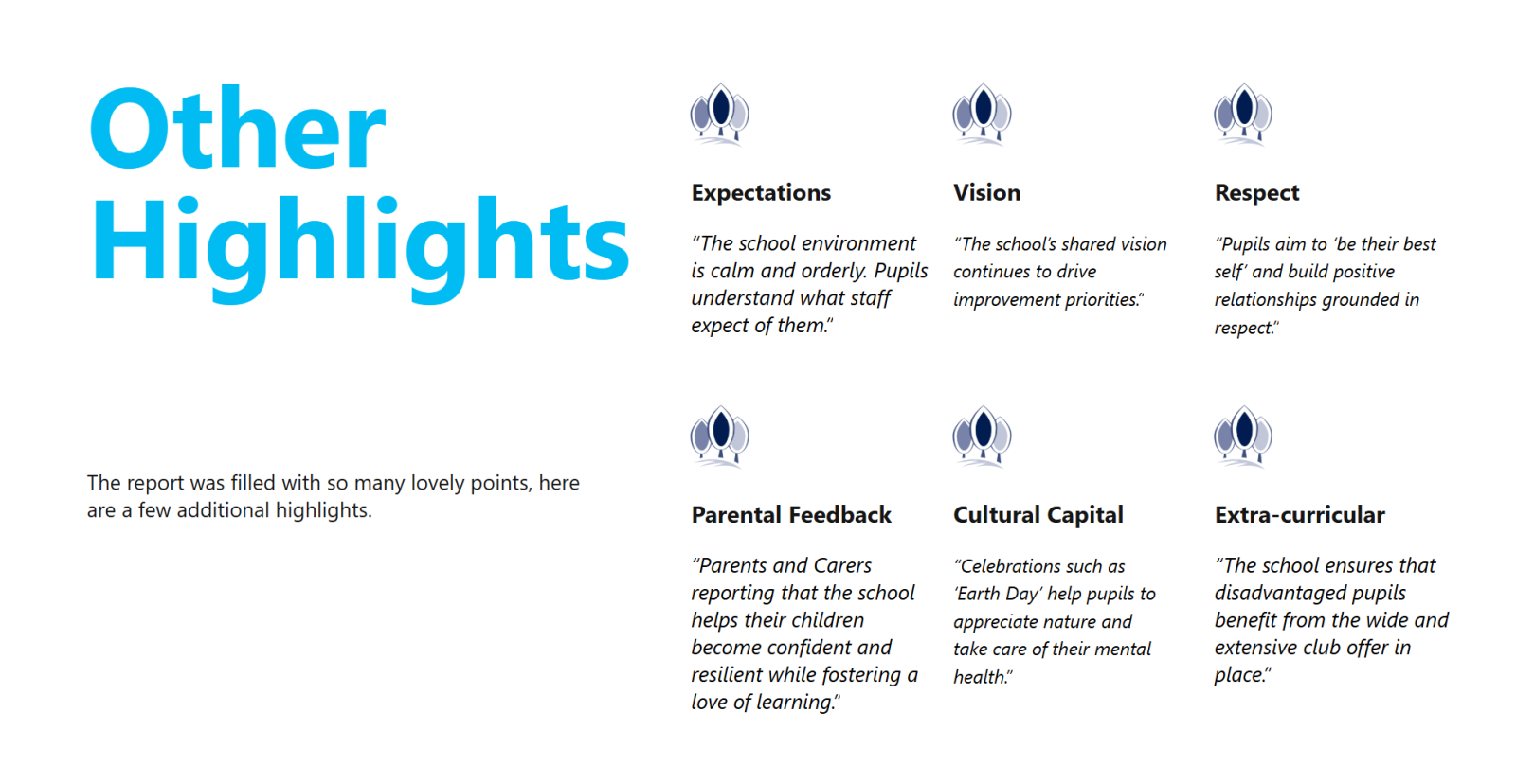 The inspectors praised the integration of ‘Tree Tops’, the school’s deaf provision, through the Total Communication approach. They noted “all pupils learn a broad curriculum, including British Sign Language. This enables pupils including deaf pupils, to play and interact with each other during social times and lessons” following on to celebrate how the “skilled staff in ‘Tree Tops’ provide deaf pupils with expert support in lesson. This enables pupils to engage fully in school life and achieve well both academically and personally.”